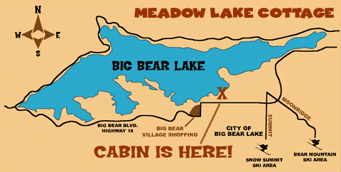 Interstate 15 to Victorville. Exit Bear Valley Road East to Lucerne Valley, Right on Highway 18 up the hill. Once on top of the hill you will see the "Dry Lake". Just follow the road and you will stay to the right of it. Turn left on to Greenway. At the light turn right onto Big Bear Blvd. Follow the road through Big Bear City into Big Bear Lake. Turn right on Georgia and right on Lahontan. Meadow Lake Cottage is the back unit and you must park in the clearly marked spaces allocated to Meadow Lake. The front door is located at the top of the driveway.